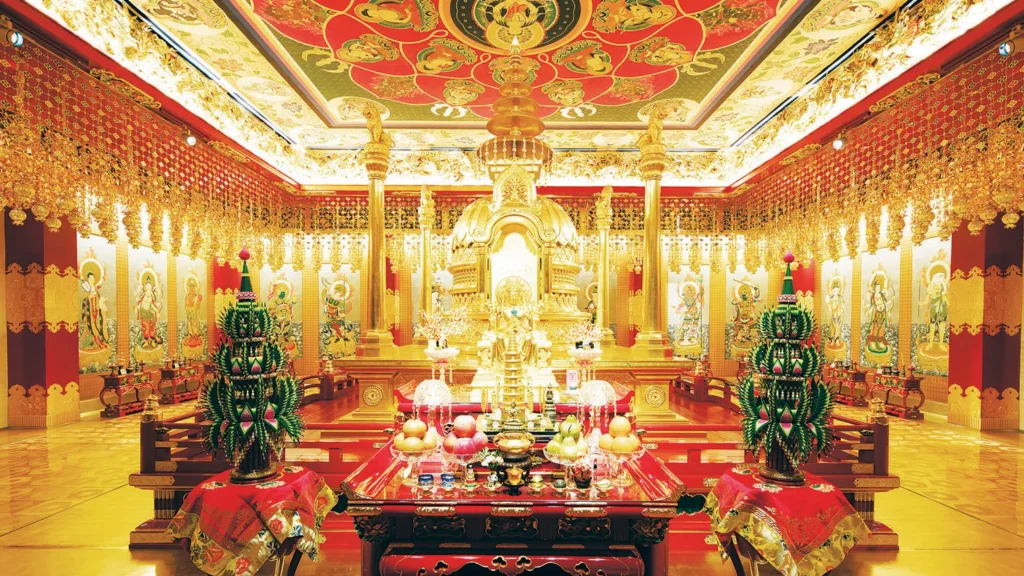 - تالار اصلی با سقف بسیار بلند، برج ناقوس، گنبد طلائی و بتکده از دیگر قسمتهای جذاب معبد است.